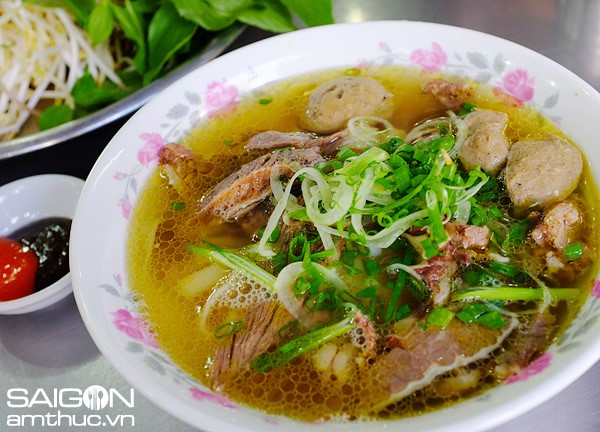 – Phở tại miền Nam thường phải bán đi kèm với tương ngọt, tương ớt đỏ và chanh, ớt tươi, ngò gai, húng quế, giá, hành tây cắt lát mỏng, đó là những loại rau bắt buộc phải có, thường là để riêng trong một dĩa hay rổ bán kèm theo từng tô phở, khách thích thứ nào thì lấy bỏ vào tô của mình. Sau này, nhiều quán còn thêm vào đĩa rau đó: ngò ôm (rau ngổ), húng Láng, hành lá dài, các loại rau thơm khác…. Nước phở thường không được bỏ bột ngọt (mì chính) như ở Hà Nội và có màu hơi đục, không trong như phở Bắc, đôi khi ngọt hơn, béo hơn và nấu bằng xương gà, thêm con khô mực hoặc củ hành nướng và gừng nướng.
