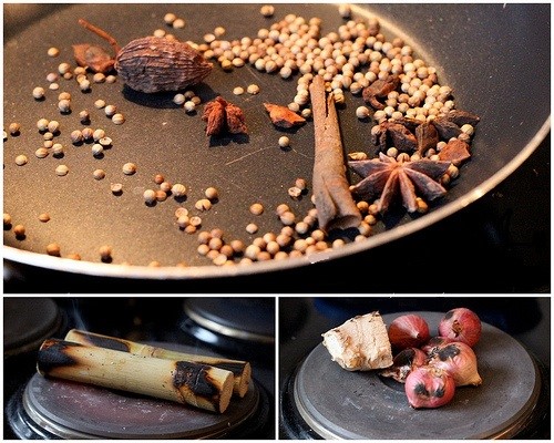 + Hoa hồi, quế, thảo quả, hạt mùi (nếu có) cho lên chảo rang ở lửa vừa đến khi dậy mùi thơm. Cho tất cả vào túi vải, buộc chặt miệng.
